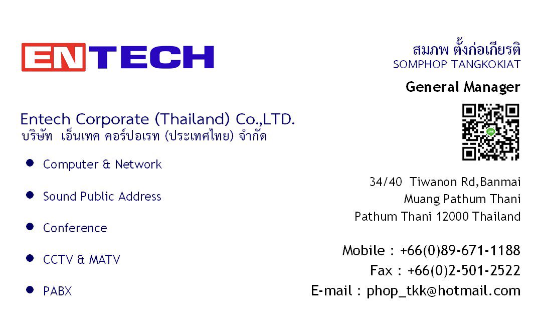 บริษัท เอ็นเทค คอร์ปอเรท (ประเทศไทย) จำกัด 34/40 ซ.ร่วมสุข 3/2 ถ.ติวานนท์ ต.บ้านใหม่ อ.เมือง จ.ปทุมธานี 12000